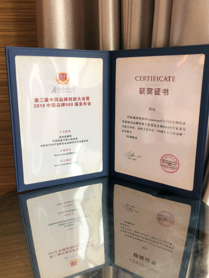 在2018中国品牌500强颁奖典礼中,柏氏以其非凡的品牌实力,和稳定增长的市场业绩,斩获【中国十大工匠品牌】重磅大奖!