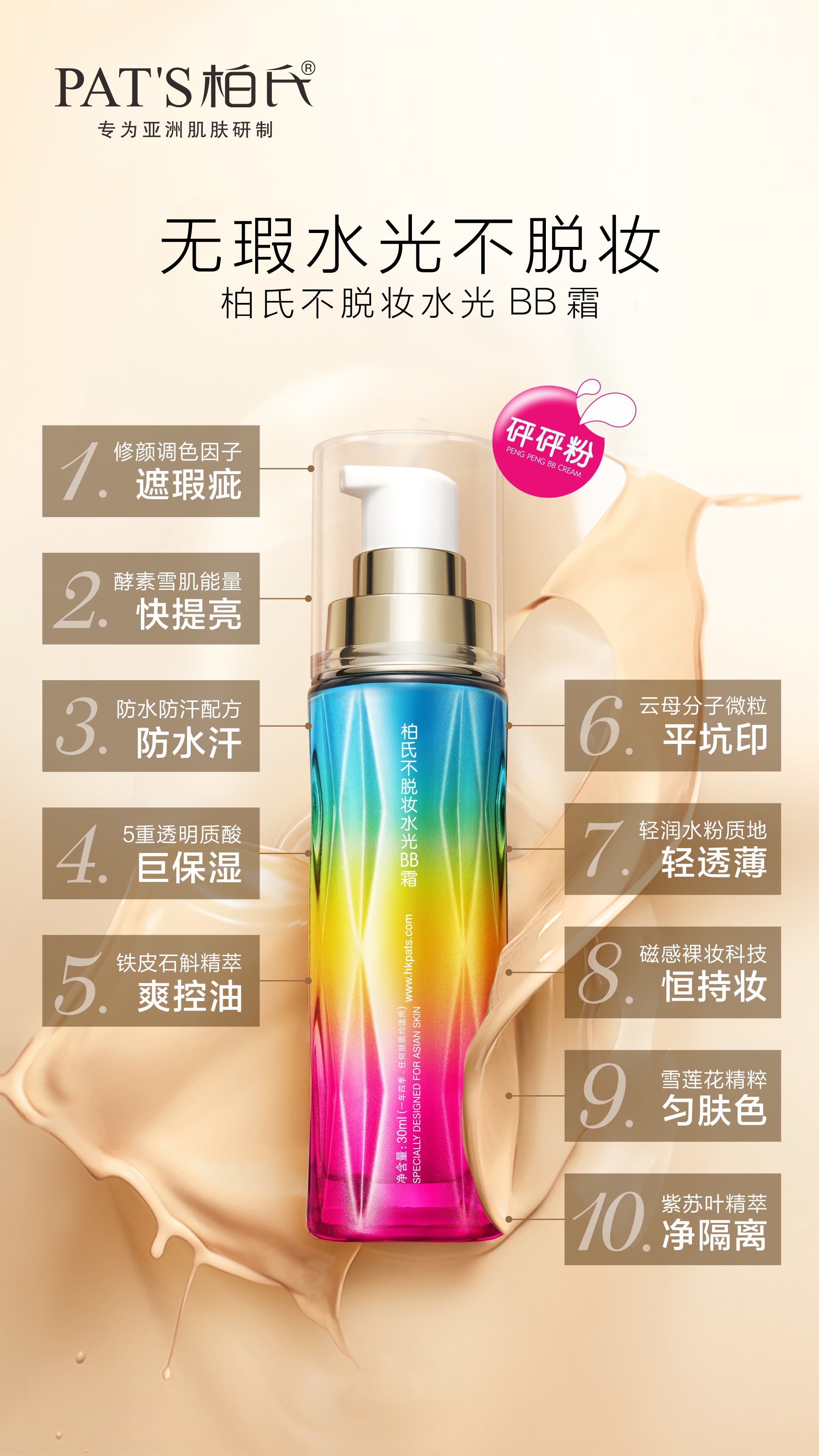 解决底妆BB霜对于油性皮肤不贴服、干性皮肤浮粉,及所有肤质面临的夏季易出汗出油而脱妆的困扰,自然保湿贴服和防水持妆实力,迅速刮起夏日一整天不脱妆的风潮!