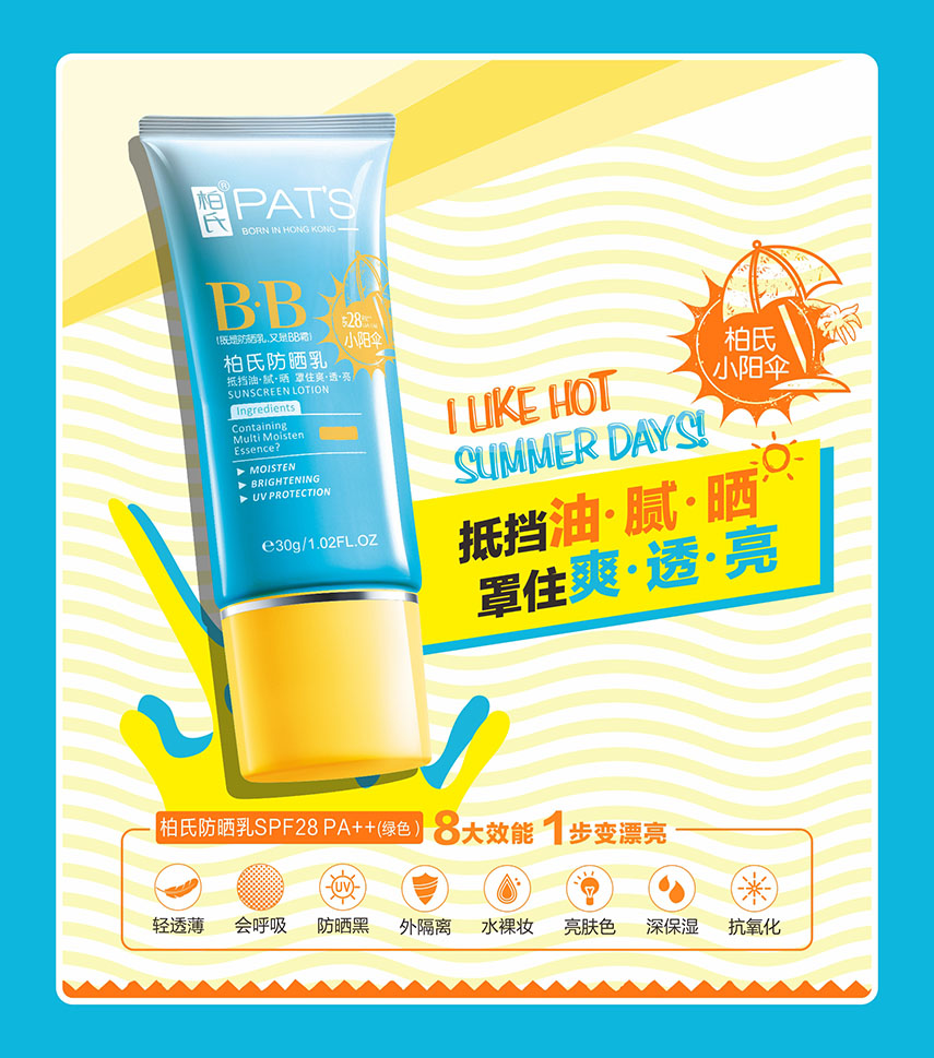 绿色•一抹完美防晒,润色修颜 防晒+裸妆,8效合一,只需一步变漂亮! 轻透薄:一抹轻盈薄透,无负担 会呼吸:清新透气,肌肤自由呼吸 防晒黑:阻隔UVA、UVB,持久防晒黑 外隔离:卓著隔离彩妆、脏空气 水裸妆:隐形瑕疵、毛孔,裸妆水润无瑕 亮肤色:均匀提亮肤色,拥有透亮好气色 深保湿:水精华深养护,阳光下不怕被晒伤 抗氧化:帮助改善黯哑,打造透亮雪肌 【适用范围】 任何肤质均适用