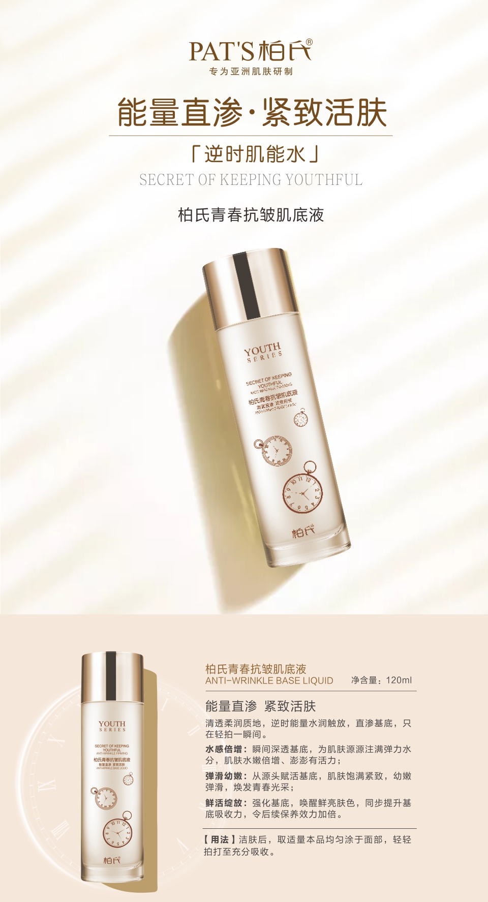 轻透柔润质地,逆时能量水润触放,瞬间深透肌底,为肌肤源源注满弹力水分,并从源头赋活肌底新生机能,使肌肤饱满紧致,幼嫩弹滑,唤醒鲜亮肤色,同步提升肌底吸收力,令后续保养效力加倍。