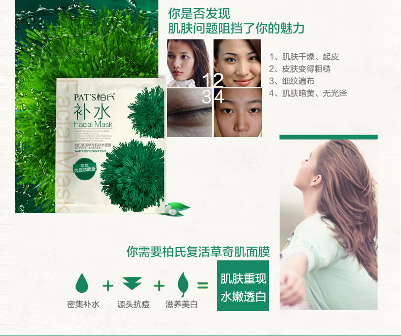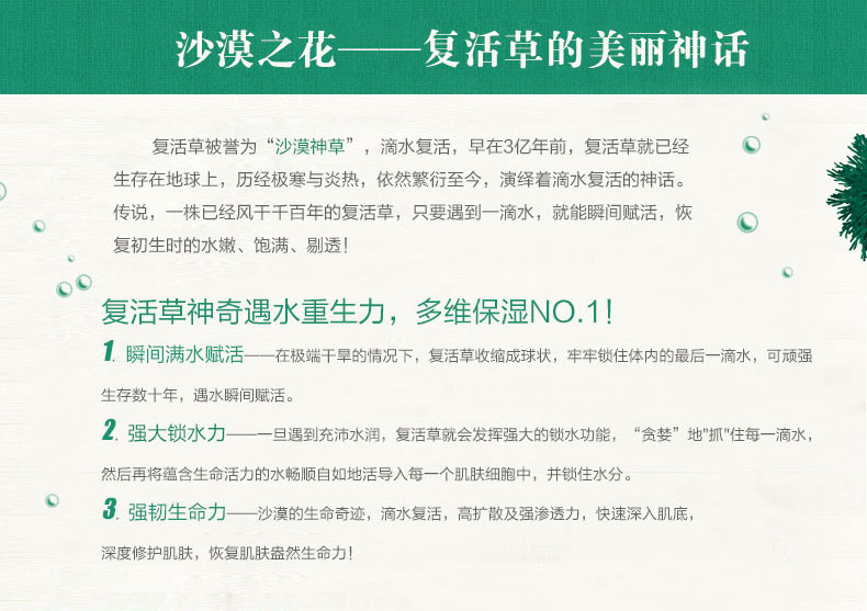 “沙漠神草”——复活草拥有5倍超强补水力量,一旦遇到充沛水润,就能发挥超大锁水功能,并将生命活水畅顺自如地导入每一个肌肤细胞中,一次解决肌肤缺水、黯淡无光的问题,同时能抚平细纹,改善暗黄无光泽、色斑遍布,使肌肤变得更有弹性。