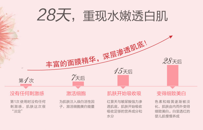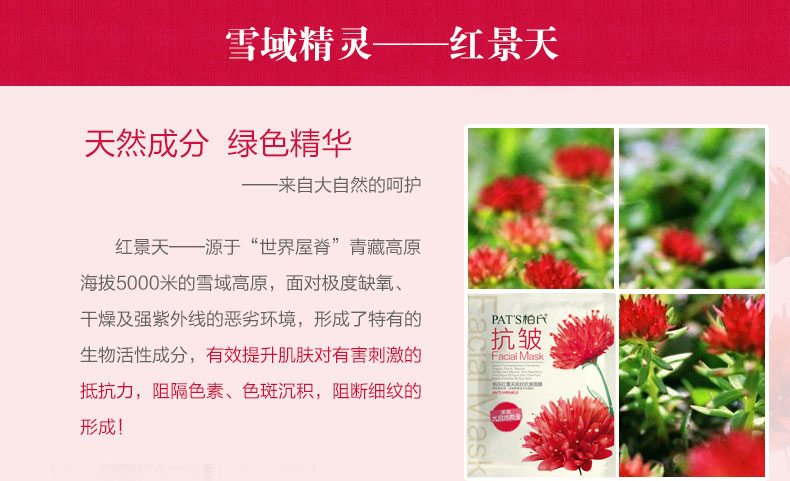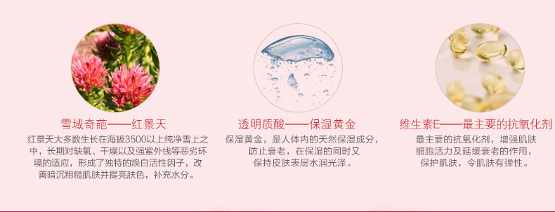 红景天特有的生物活性成分,能有效提升肌肤对有害刺激的抵抗力,阻隔色素、色斑沉积,阻断细纹的形成。补水锁湿,让肌肤瞬间满水赋活,同时能抗纹抗皱,祛除细纹,利用其高扩散及强渗透力,快速深入肌底,深度修护肌肤暗黄,恢复肌肤盎然生命力。