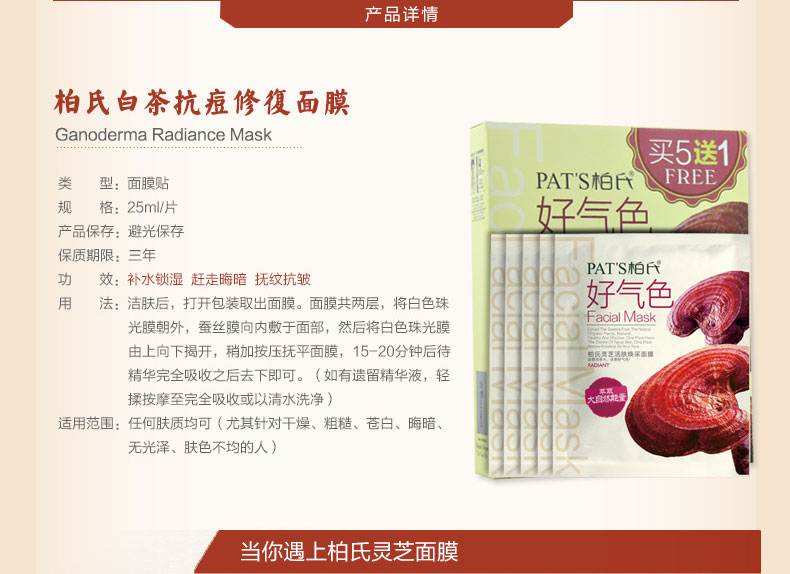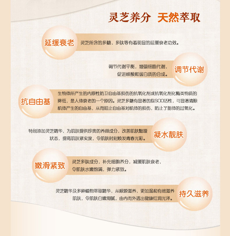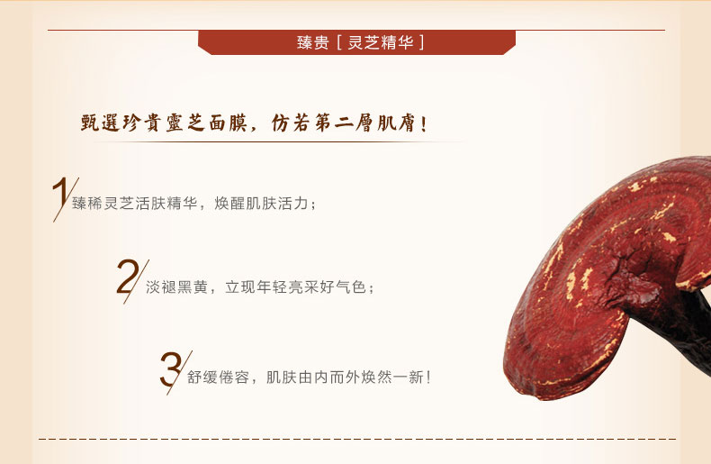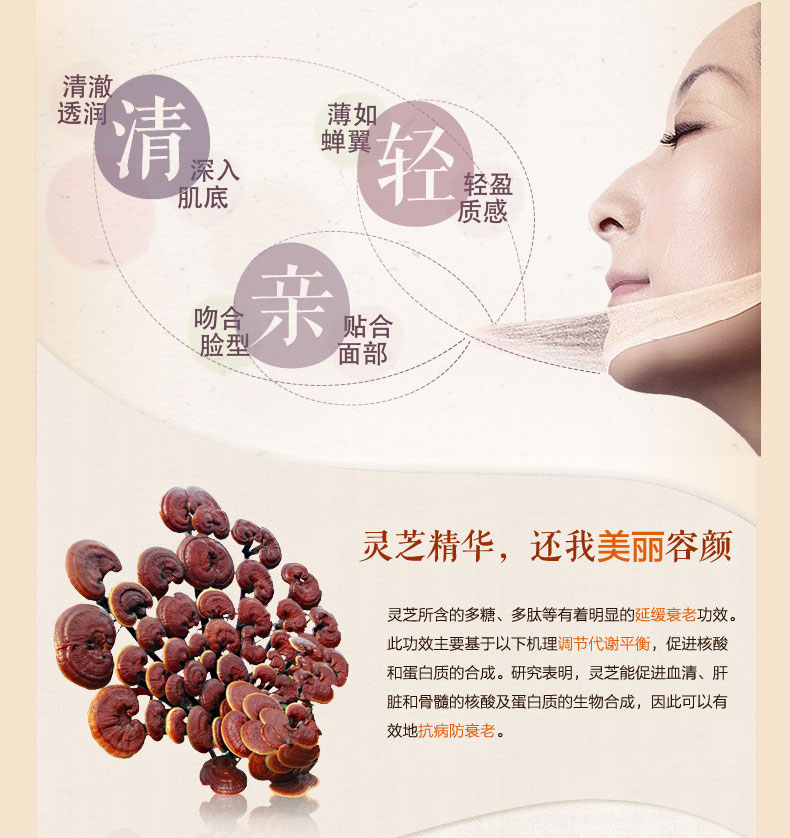 面膜中含有的灵芝精华富含多糖、多肽,可以起到延缓衰老功效,为肌肤提供珍贵的养颜成分,改善肌肤暗哑状态,提高肌肤紧实度,调节代谢平衡,令肌肤水嫩饱满、弹力紧致,从根源滋养,更加温和有效润泽肌肤,令肌肤白嫩滑腻,由内而外透出健康红润光泽。