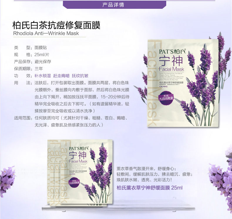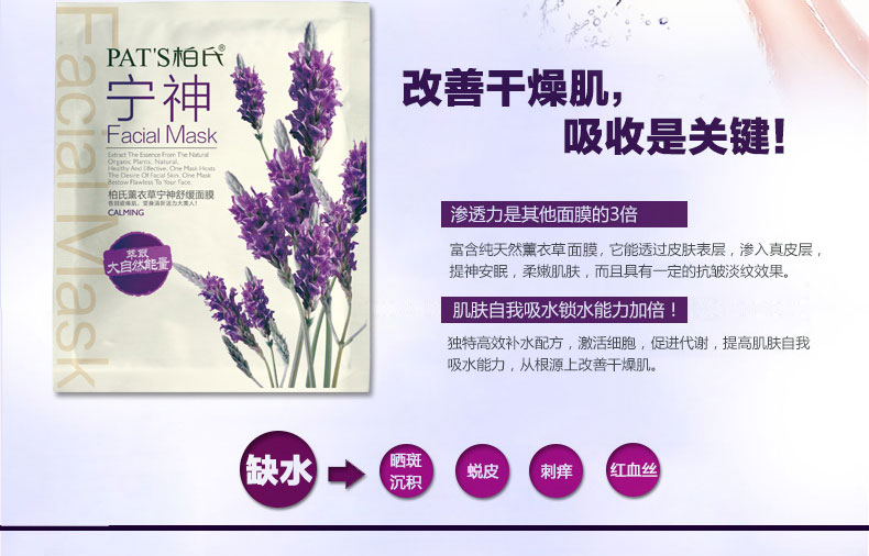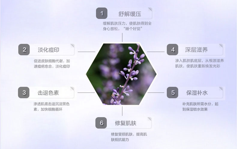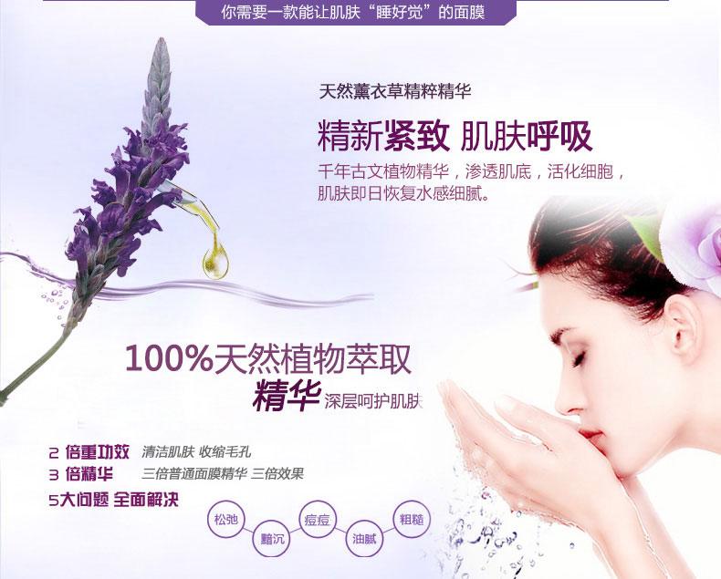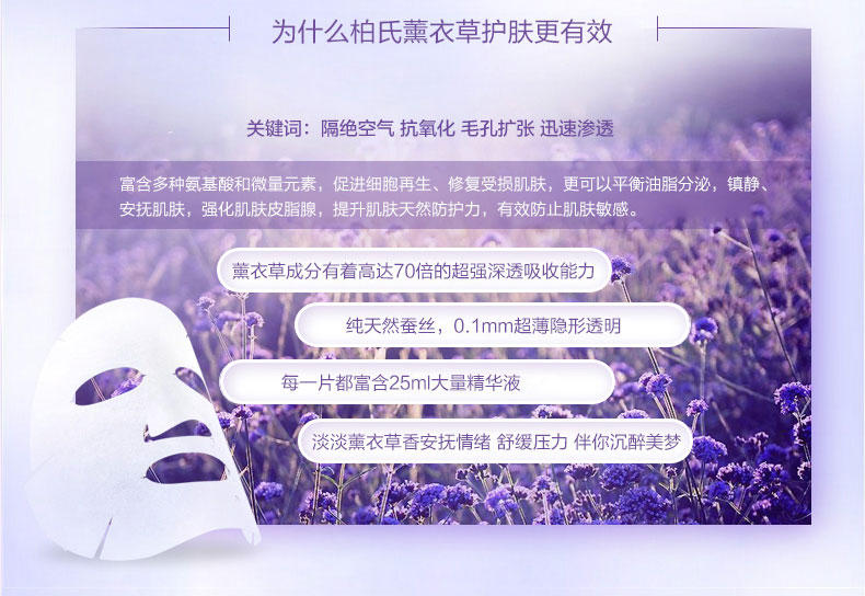 天然薰衣草精粹精华,能透过皮肤表层,渗入真皮层,提神安眠,柔嫩肌肤,而且具有一定的抗皱淡纹效果。独特高效补水配方,激活细胞,促进代谢,提高肌肤自我吸水能力,从根源上改善干燥肌。