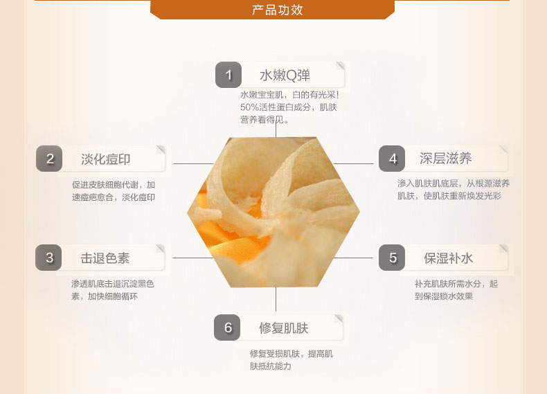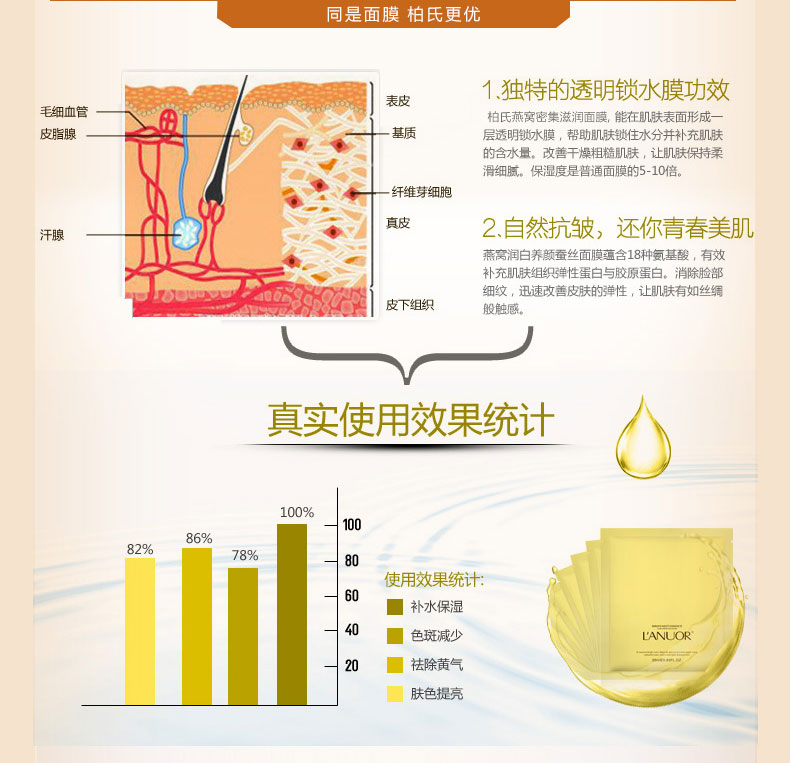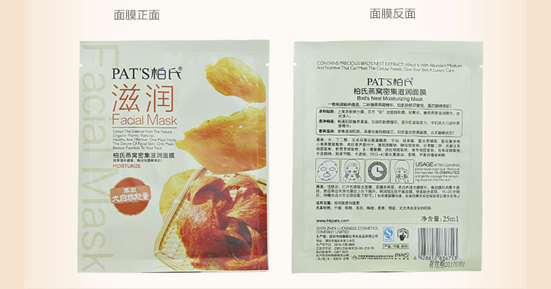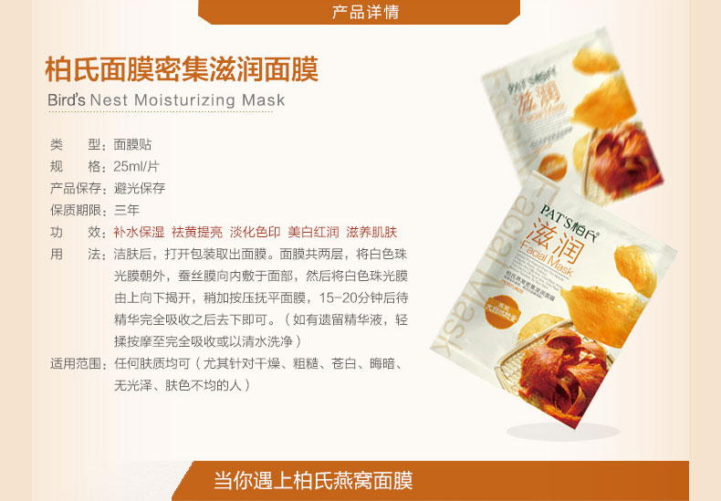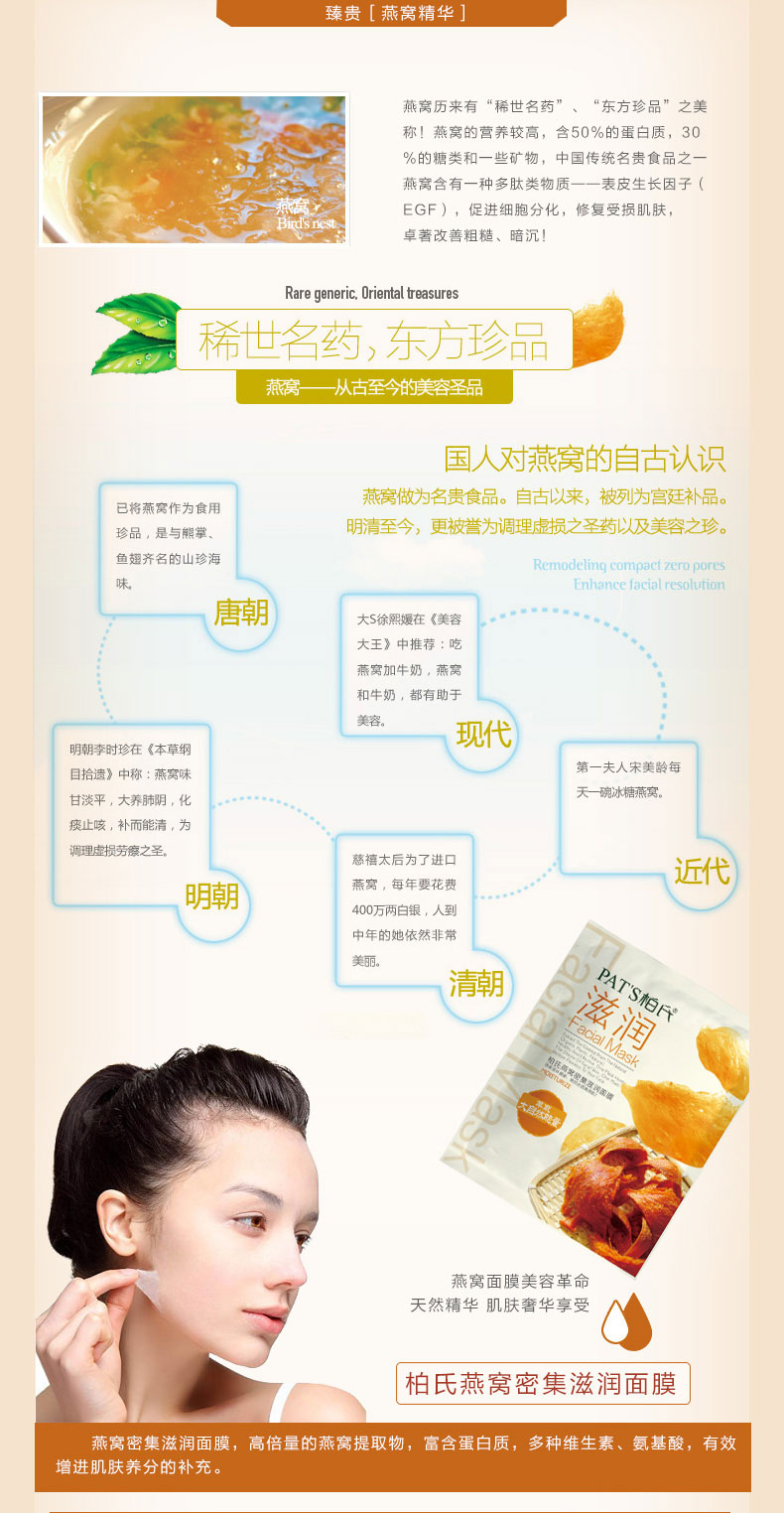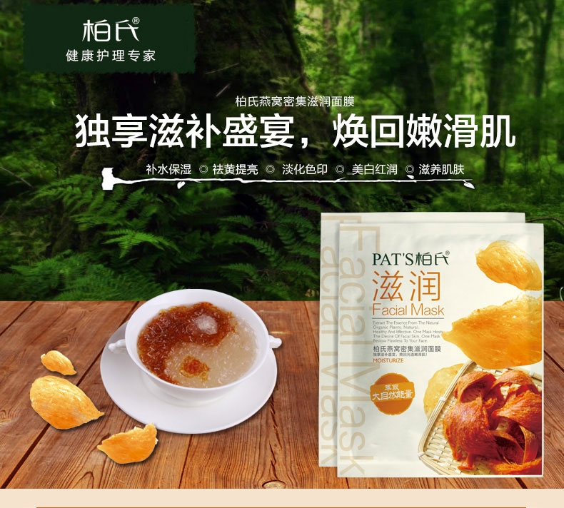 燕窝密集滋润面膜,高倍量的燕窝提取物,50%活性蛋白成分,肌肤营养看得见。促进皮肤细胞代谢,加速痘疤愈合,淡化痘印,同时渗透肌底击退沉淀黑色素,加快细胞循环,从根源滋养肌肤,使肌肤重新焕发光彩,补充肌肤所需水分,起到保湿锁水效果,修复受损肌肤,提高肌肤抵抗能力。