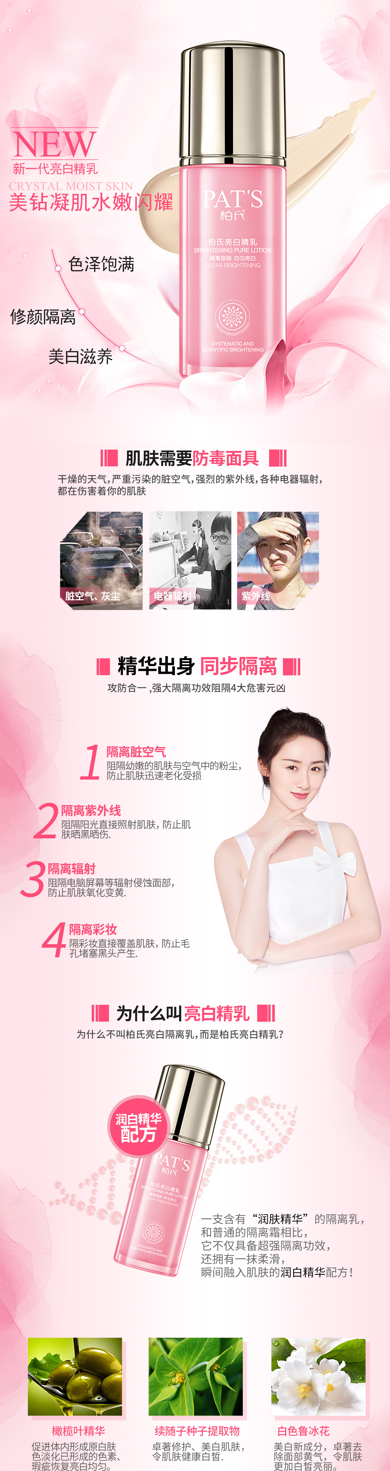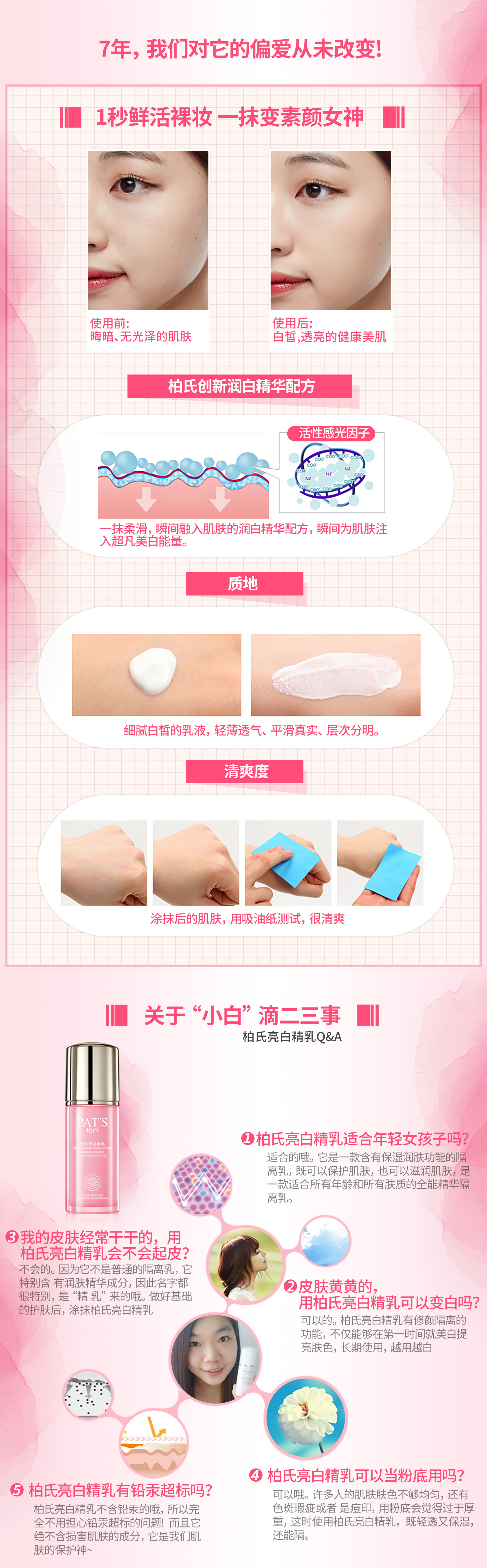 一抹柔滑,瞬间为肌肤注入亮颜能量,即刻提亮肤色,改善晦暗,隐退色印、瑕疵,令肌肤崭露清新透白;特别添加活性感光粒子,卓著修颜美肤,隔离防护外界不良物的侵入,令脸部尽情焕发自然健康、平滑真实、层次分明、和谐幻美的白皙光采。