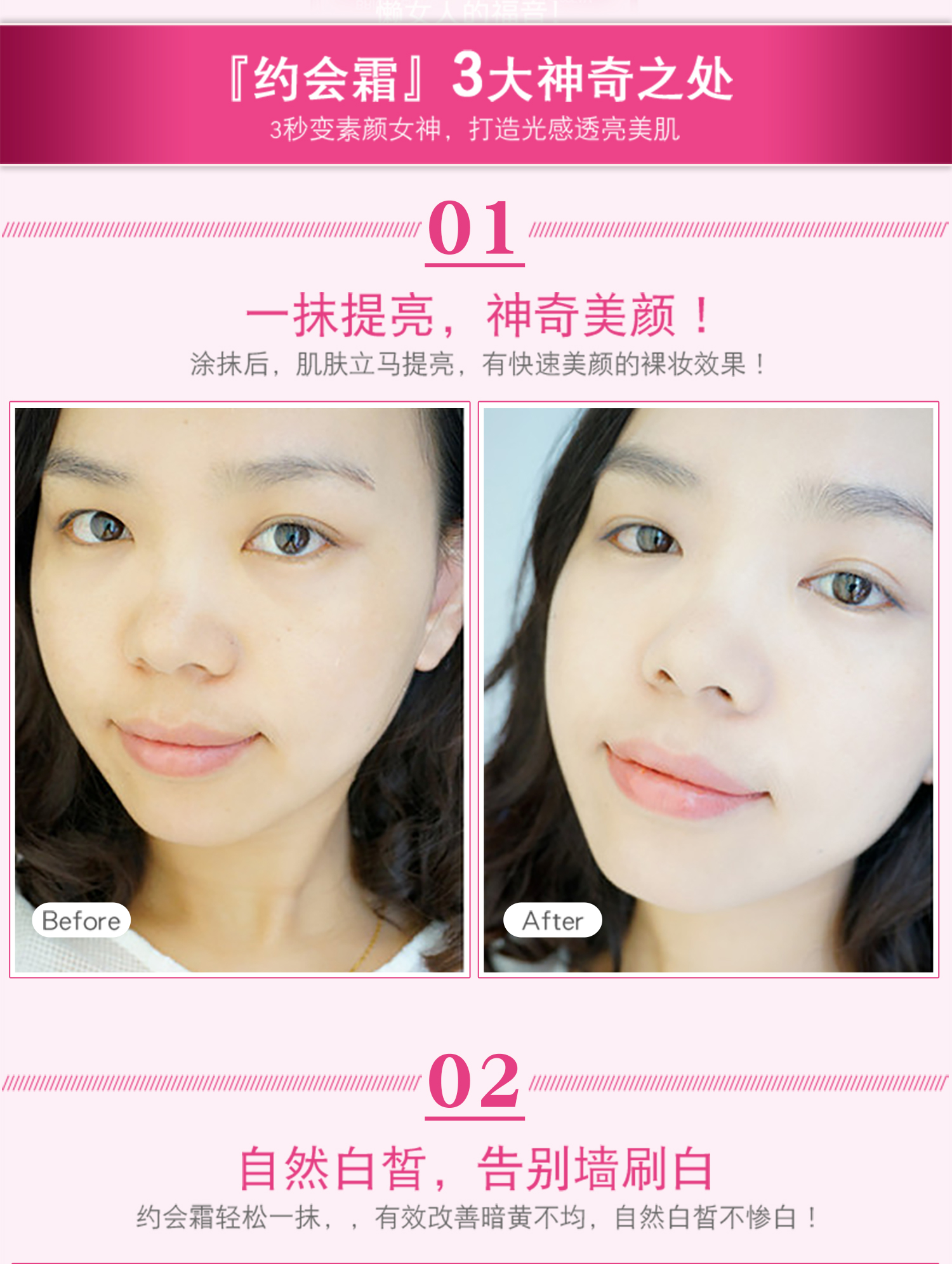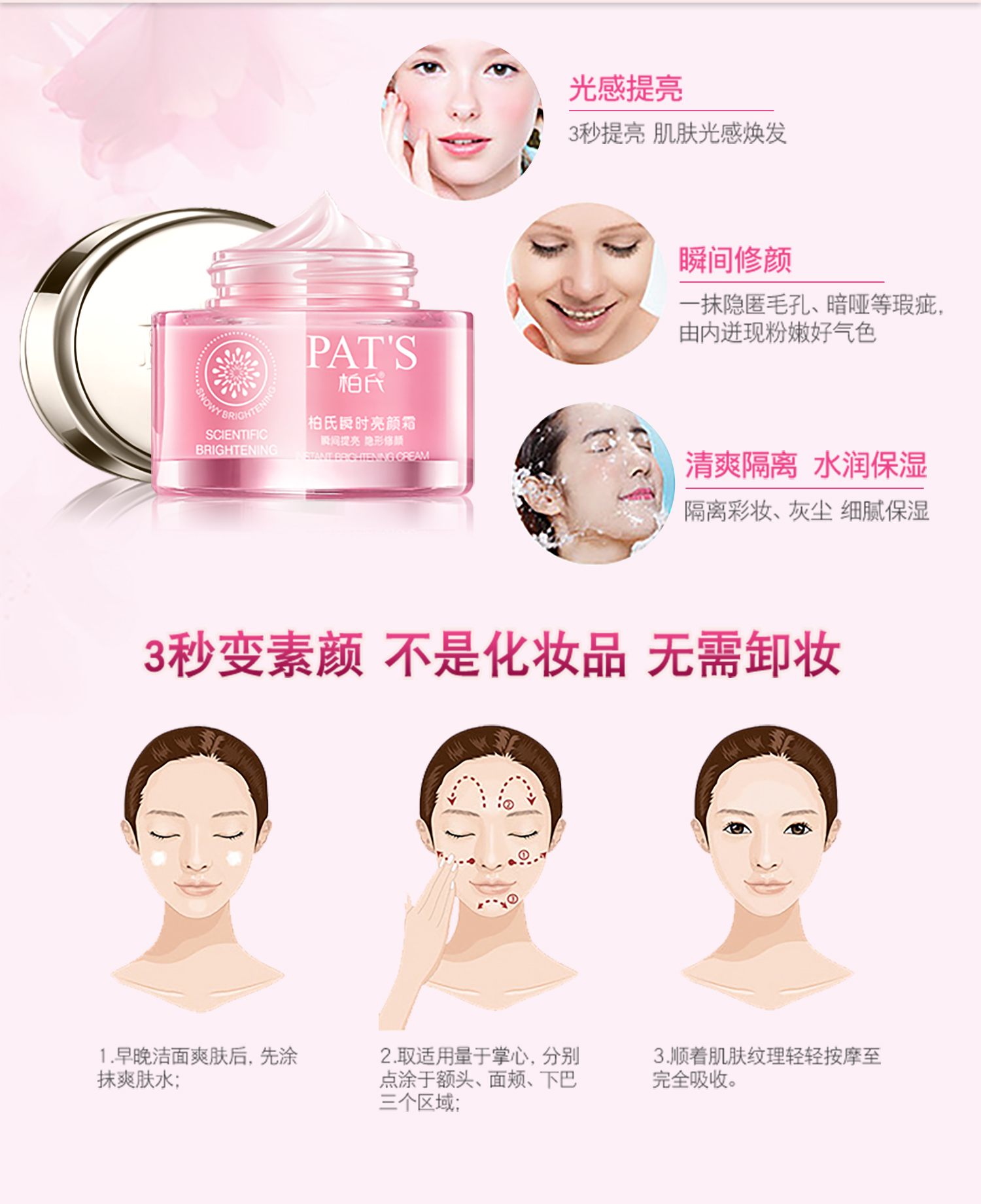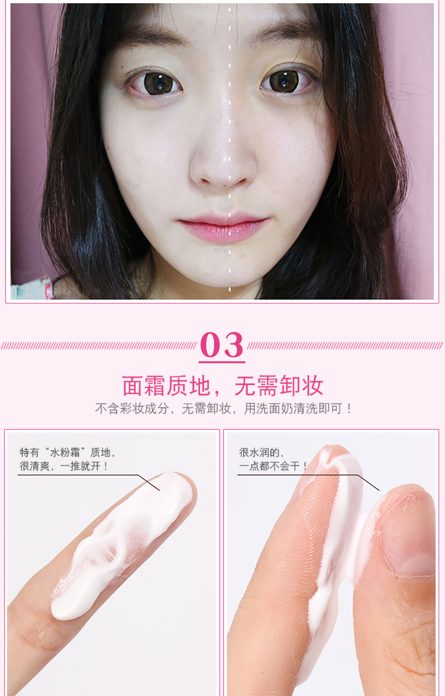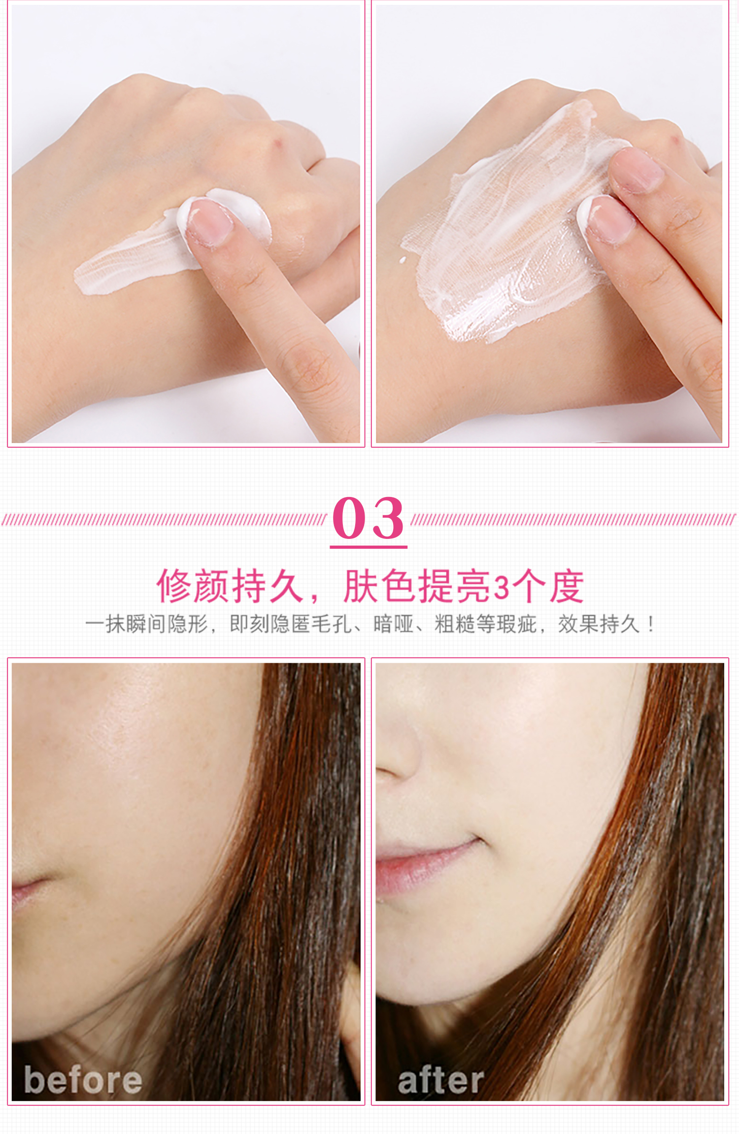 功效: 轻盈柔润的乳霜质地,融合创新美颜技术,一抹瞬间隐 形,即刻隐匿毛孔、暗哑、粗糙等瑕疵;完美修颜,整 体提亮肤色,立现天生般无瑕透亮、粉嫩好气色;让你 无论是在约会中、逛街时、工作上都能时刻展现宛若樱 花般粉润诱人、怦然心动的素颜美肌。 适用范围:任何肤质均适用