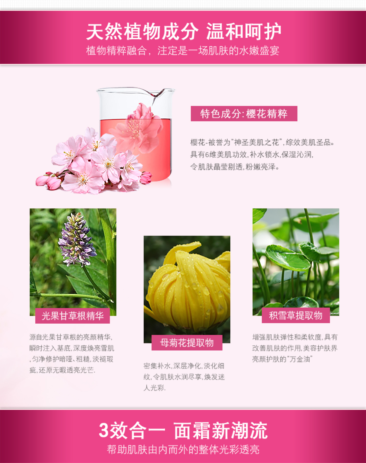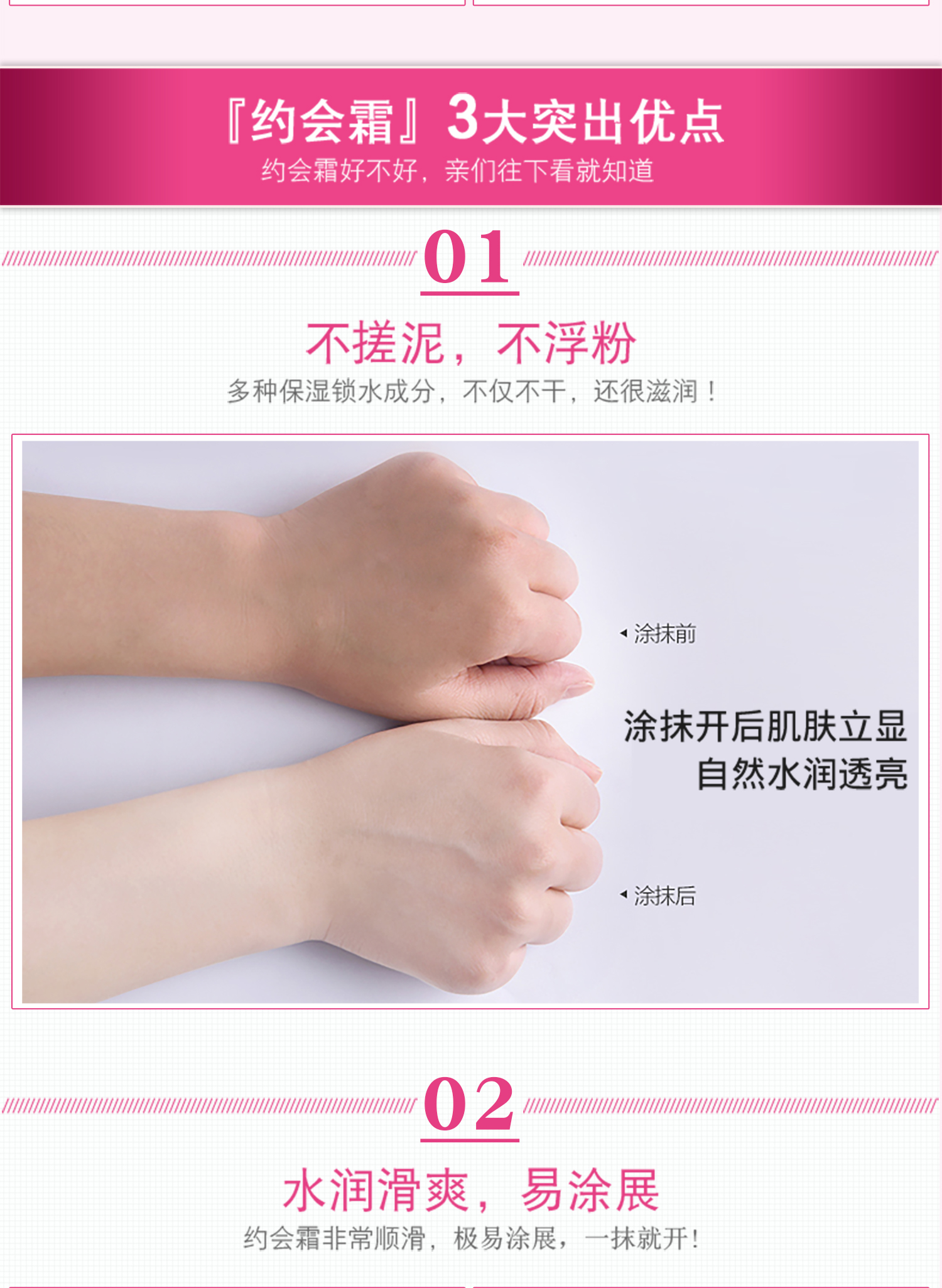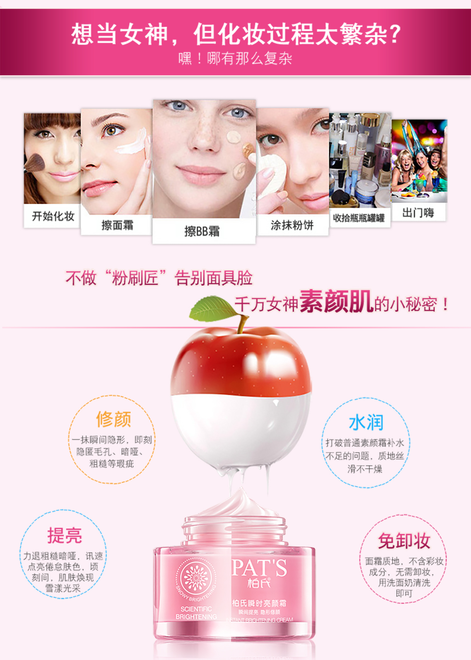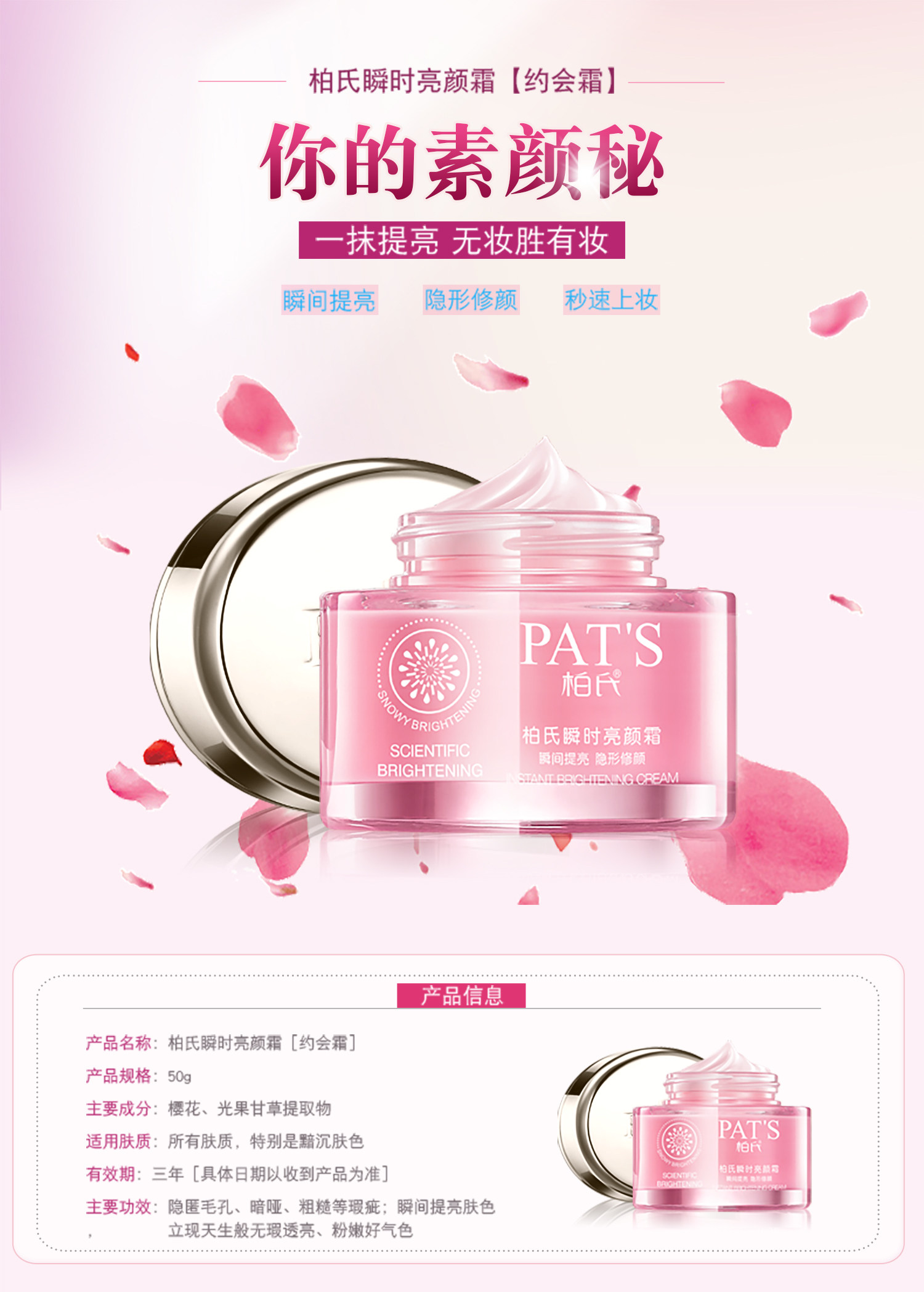 功效: 轻盈柔润的乳霜质地,融合创新美颜技术,一抹瞬间隐 形,即刻隐匿毛孔、暗哑、粗糙等瑕疵;完美修颜,整 体提亮肤色,立现天生般无瑕透亮、粉嫩好气色;让你 无论是在约会中、逛街时、工作上都能时刻展现宛若樱 花般粉润诱人、怦然心动的素颜美肌。 适用范围:任何肤质均适用