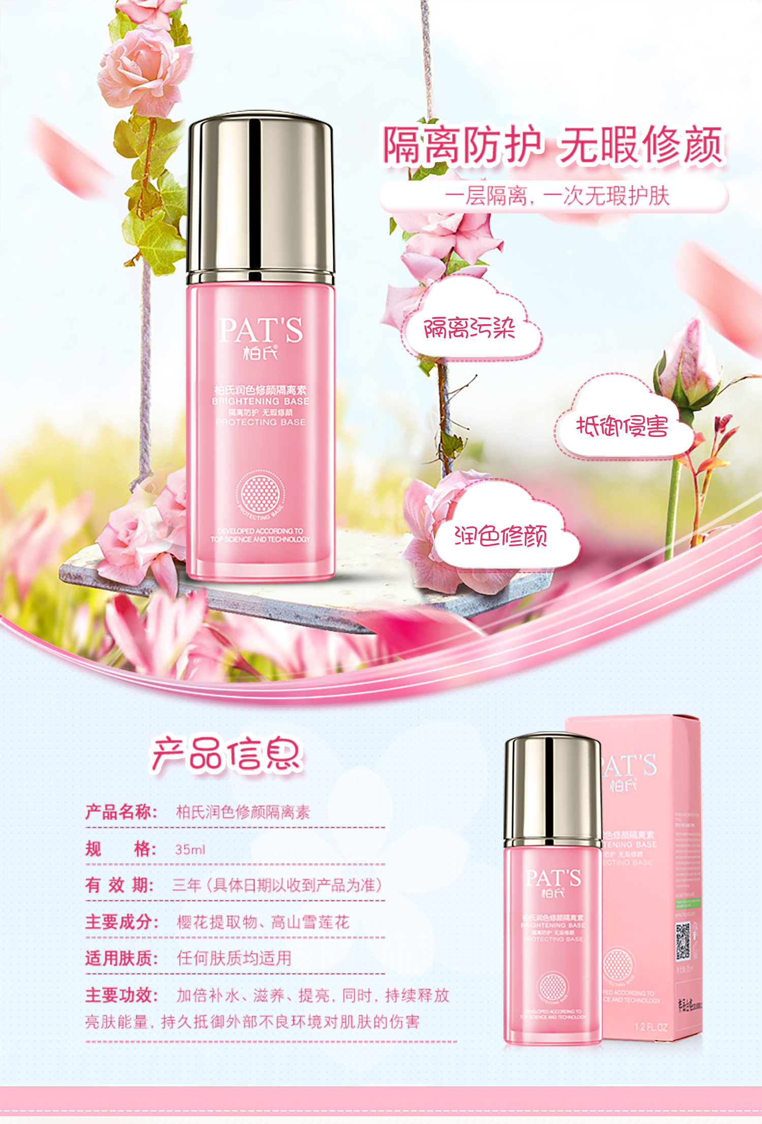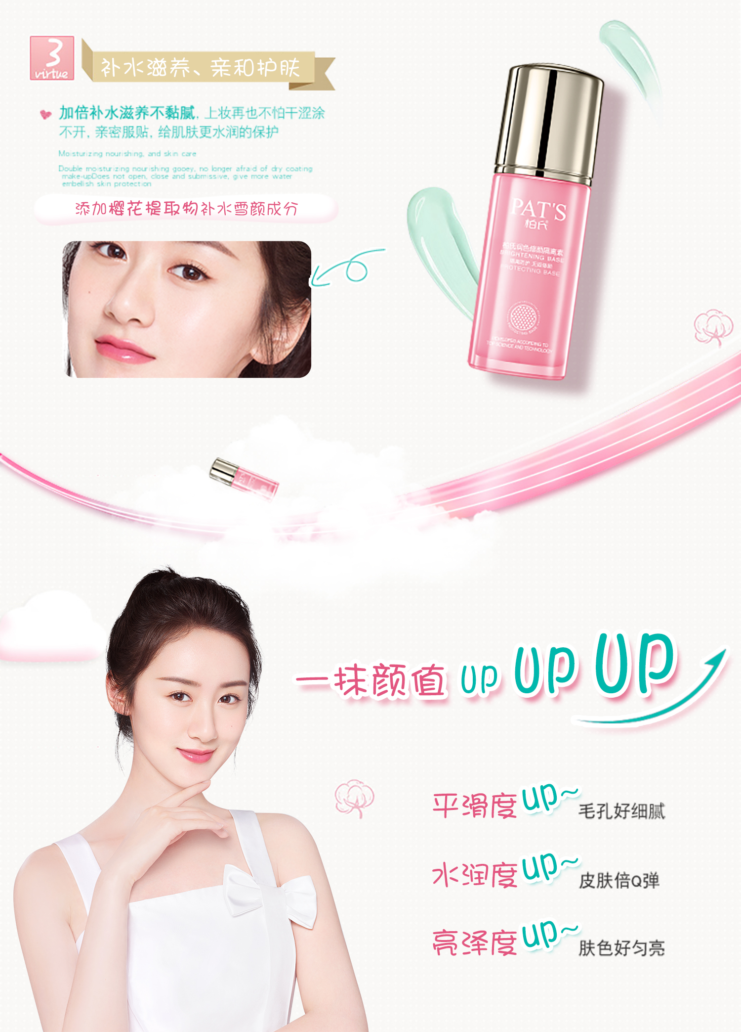 功能:柔滑清爽的质地,即刻与肌肤精准融合,清盈、服贴、透气、智慧修饰肌肤,加倍补水、滋养、提亮,同时,持续释放亮肤能量,持久抵御外界不良环境对肌肤的伤害。独蕴光学反射科技,转瞬点亮黯淡肤色、塑造柔滑粉嫩容颜,让您瞬即感受肌肤成倍澄净透亮的美妙惊喜! 用法:于日常护肤保养之最后程序使用,取适量本品均与涂于面部。 适用范围:任何肤质均适用